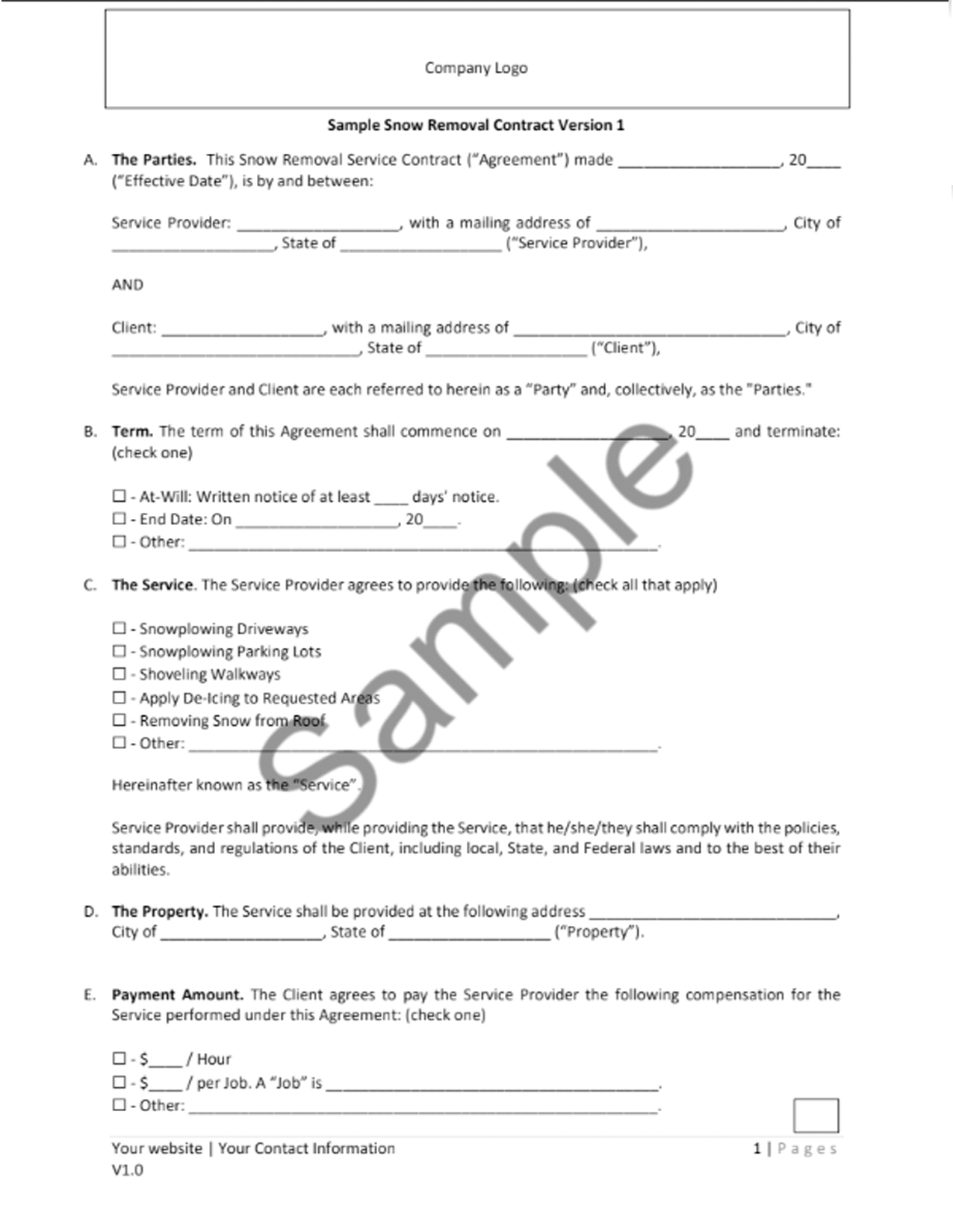 An editable & Customizable Snow Removal agreement. Print or download your contract for free. Quick and easy. Don't forget to customize it by adding your details and information where it is required. The information provided by us is for general informational purposes only. All information on the site and mobile application is provided in good faith, however we make no representation or warranty of any kind, express or implied, regarding the accuracy, adequacy, validity, reliability, availability, or completeness of any information on the Site or our mobile application. The legal information is provided for general informational and educational purposes only and is not a substitute for professional advice. Accordingly, before taking any actions based upon such information, we encourage you to consult with the appropriate professionals.
