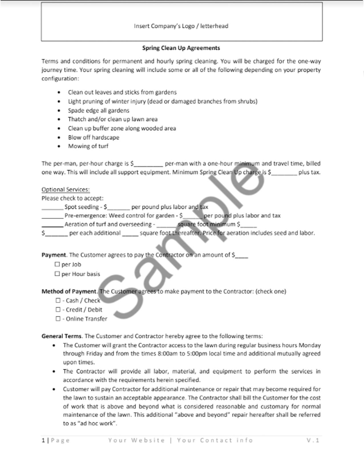 Create a customized Cleaning Services Agreement for your Spring & Aeration services. Print or download your contract template for free. Quick and easy. Don't forget to customize it by adding your details and information where it is required. Disclaimer: The information provided by us is for general informational purposes only. All information on the site and mobile application is provided in good faith, however we make no representation or warranty of any kind, express or implied, regarding the accuracy, adequacy, validity, reliability, availability, or completeness of any information on the Site or our mobile application. The legal information is provided for general informational and educational purposes only and is not a substitute for professional advice. Accordingly, before taking any actions based upon such information, we encourage you to consult with the appropriate professionals.