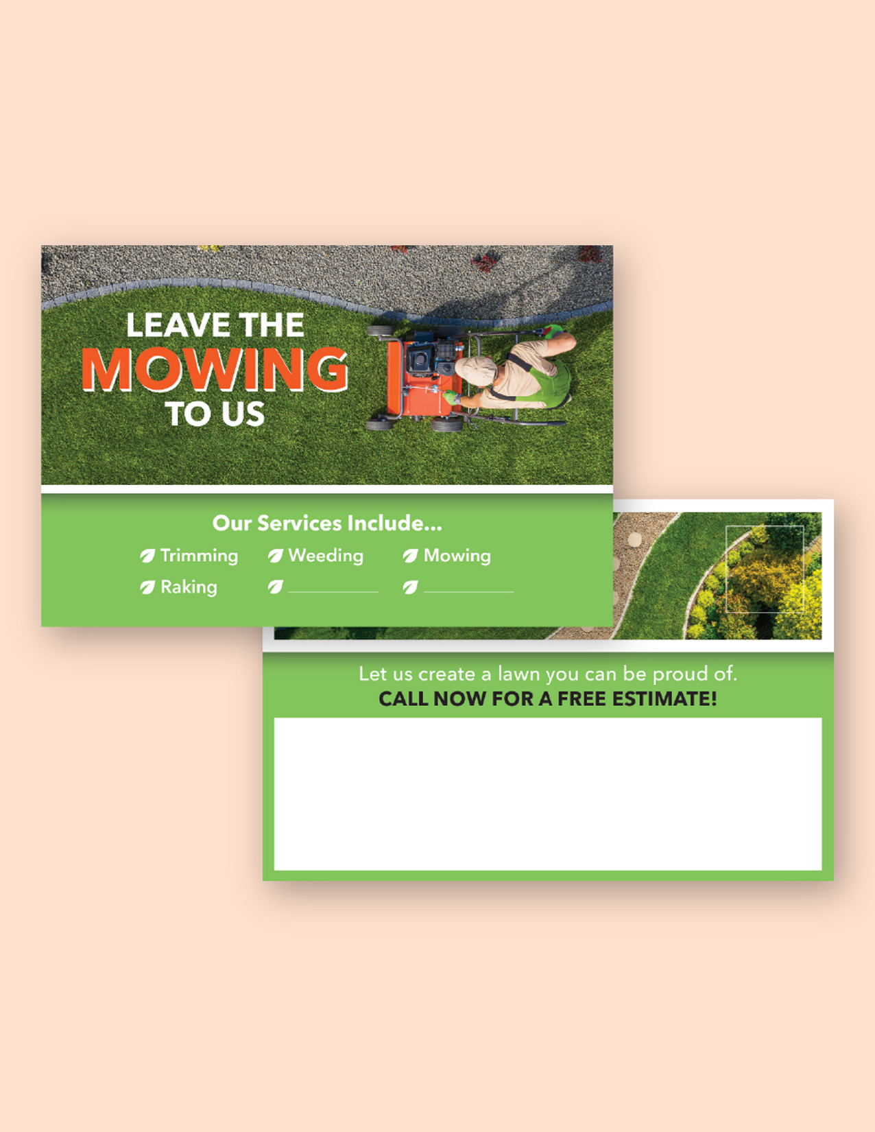 Bright and colorful postcard focusing on mowing services. Download this print-ready file and take it to your printer! Don't forget to customize it by adding your contact details.Size: 6in x 4in